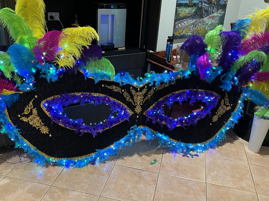 Bring vibrant Rio-inspired styling to your event with our oversized carnival mask prop. Featuring colourful feathers, glowing lights and striking detail, this statement piece is ideal for entrances, photobooths and themed event styling.