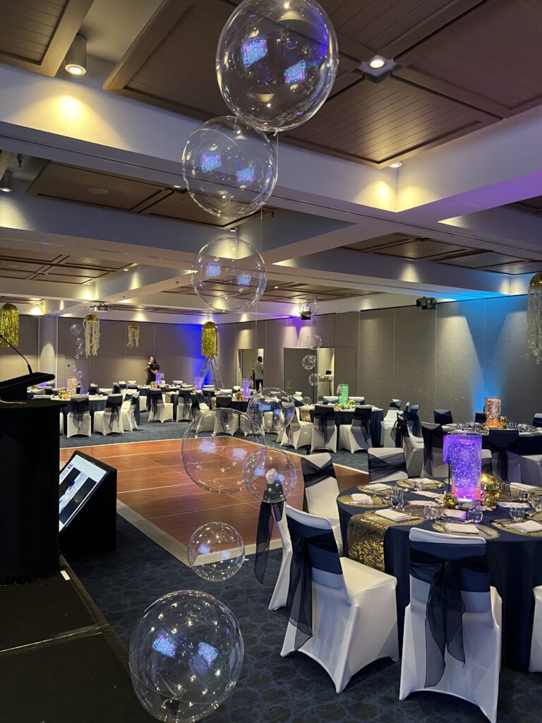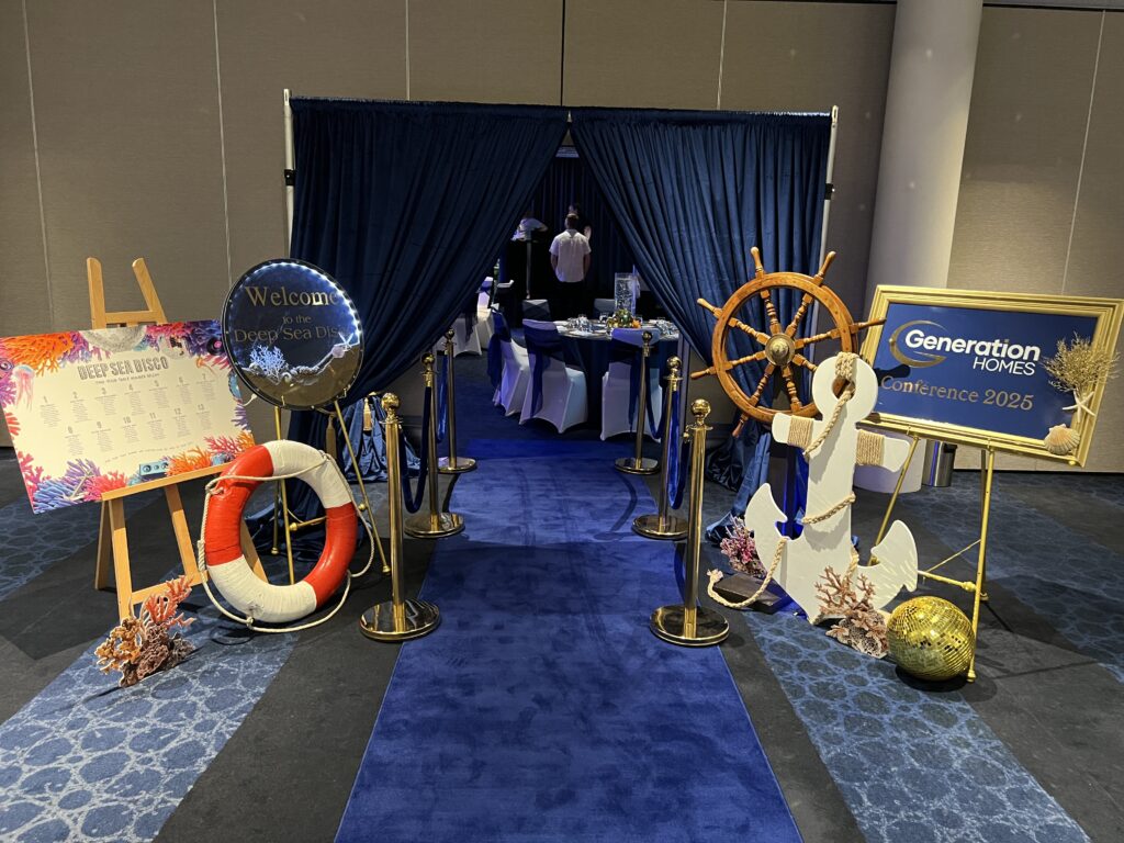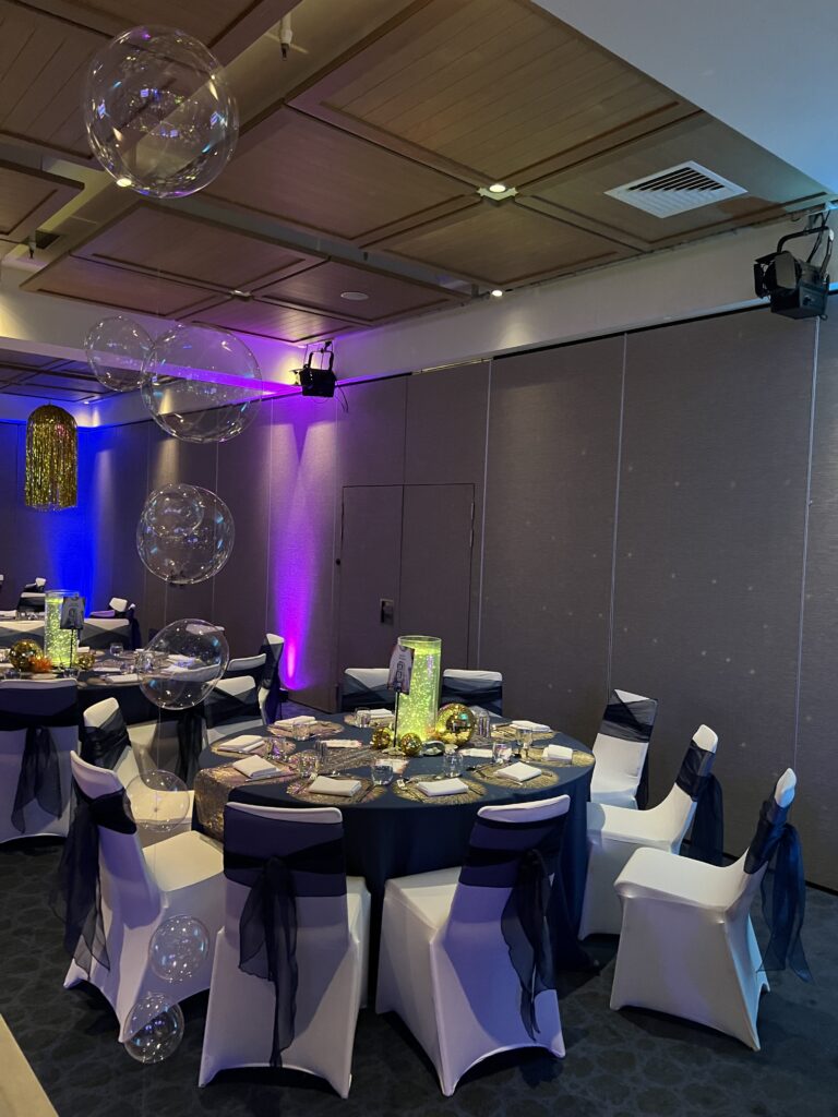 ⚓ Navy & Gold Luxe Styling – Rich blue draping, gold-accented table settings, and shimmering elements evoke a sleek yacht club feel.